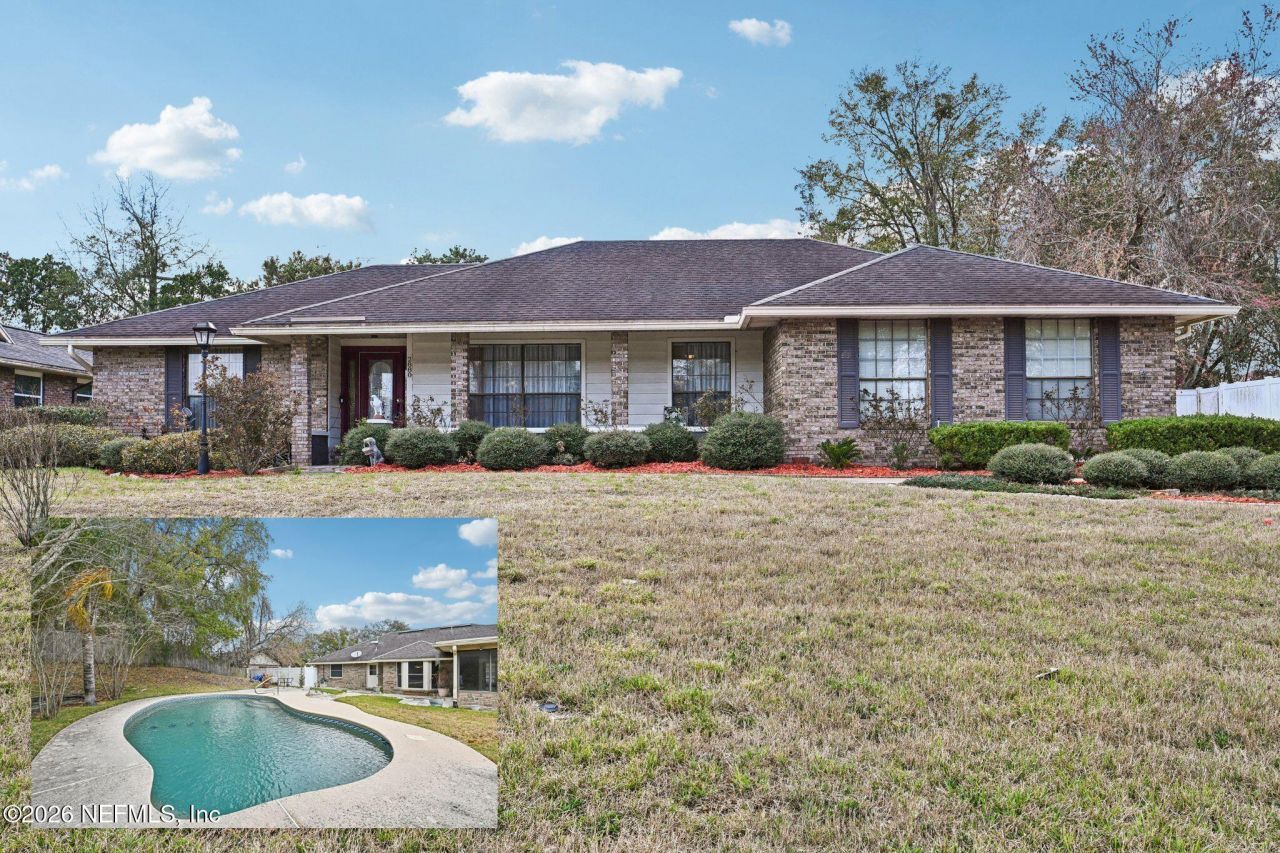 Spacious 4-bedroom, 3-bath home with approximately 2,315 sq ft on a private lot in Orange Park. The updated kitchen features quartz countertops and ample prep space. Laminate flooring runs through the main living areas, and the family room includes a wood-burning fireplace. Recent improvements include a full home replumb, fresh interior paint, and updated bathrooms. The screened porch overlooks the backyard and pool with a pebble-finish surface, providing a great space for outdoor living and entertaining. The property also features a long driveway leading to a side-entry garage, offering additional parking and curb appeal. Conveniently located near shopping, dining, schools, and major commuter routes.